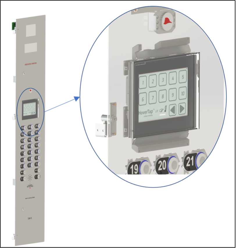 A rendering of HoverTap’s touchless screen integrated within the COP of an elevator cabin.